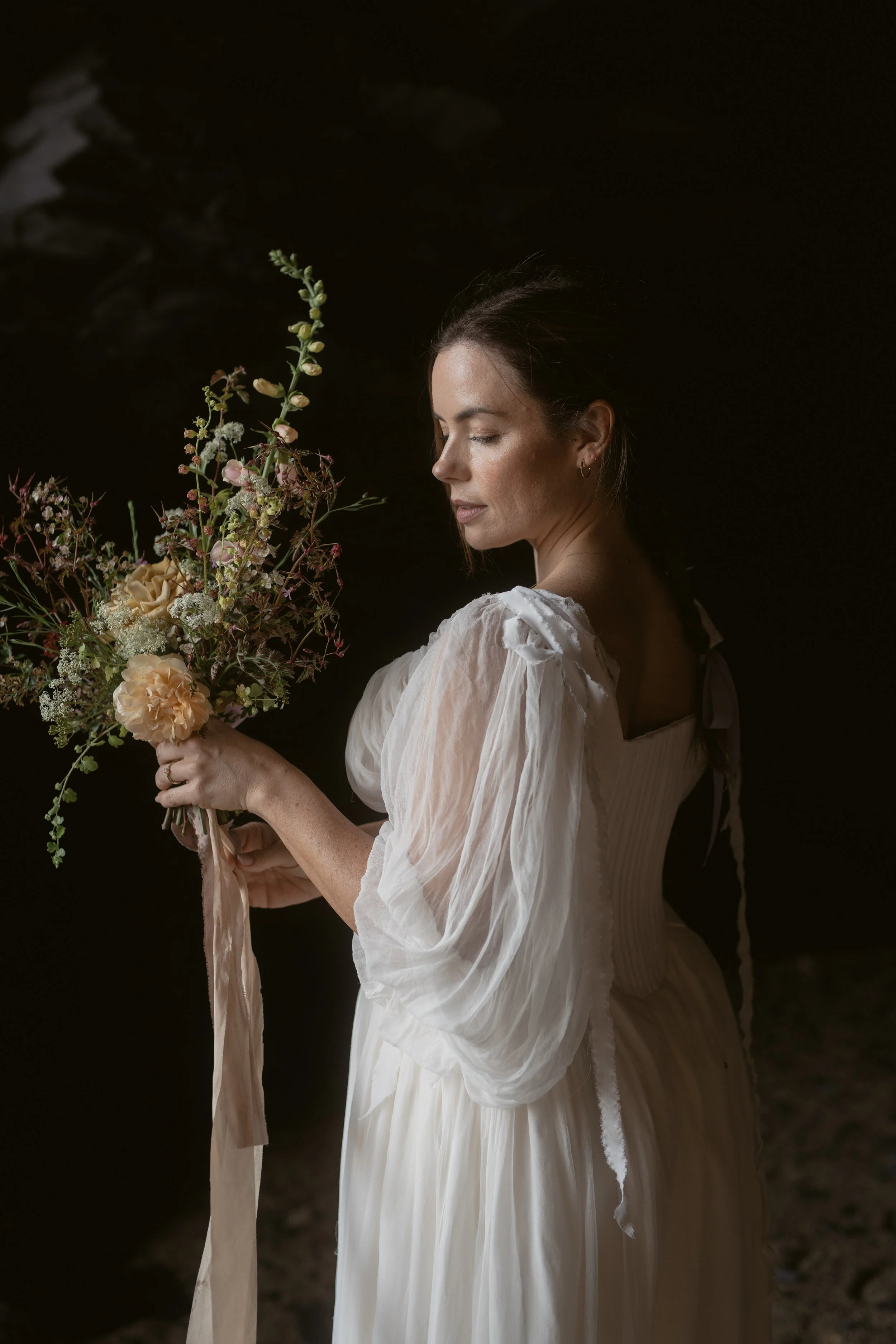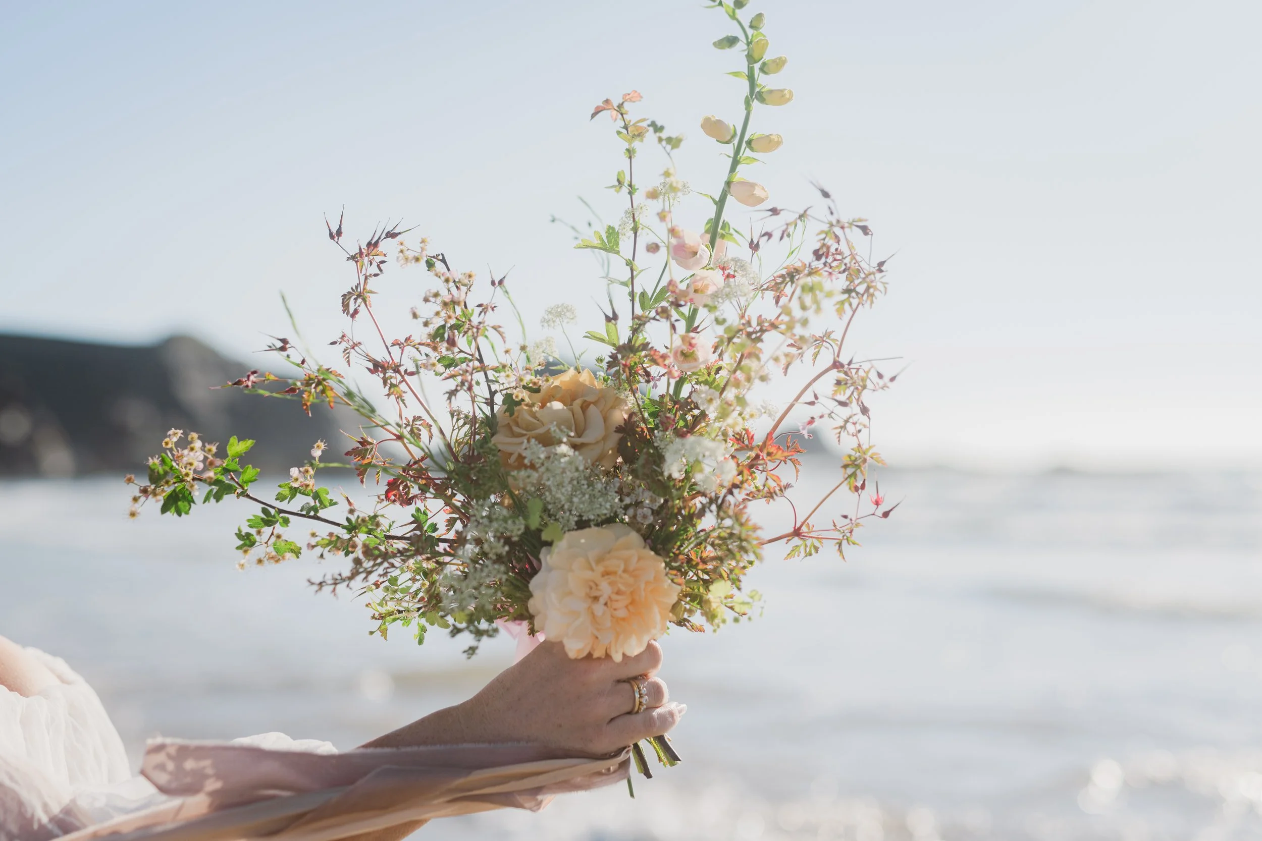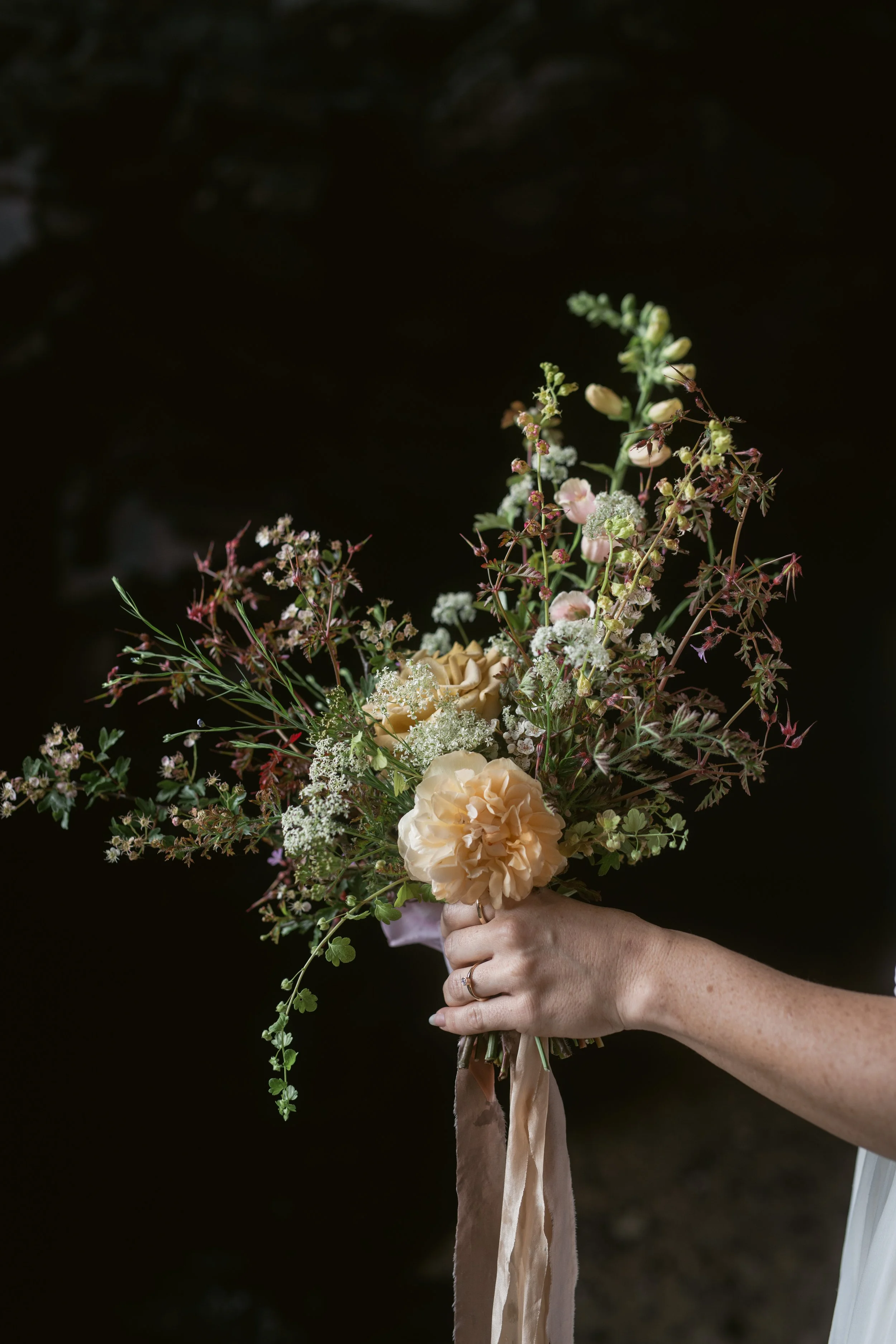 Late May garden gathered bouquet featuring David Austin roses, foxloves, cow parsley, hawthorn blossom
