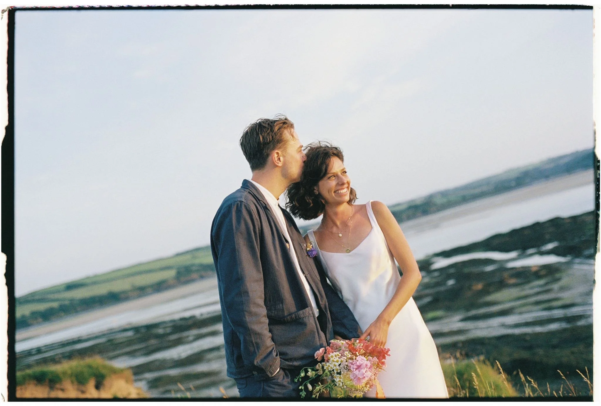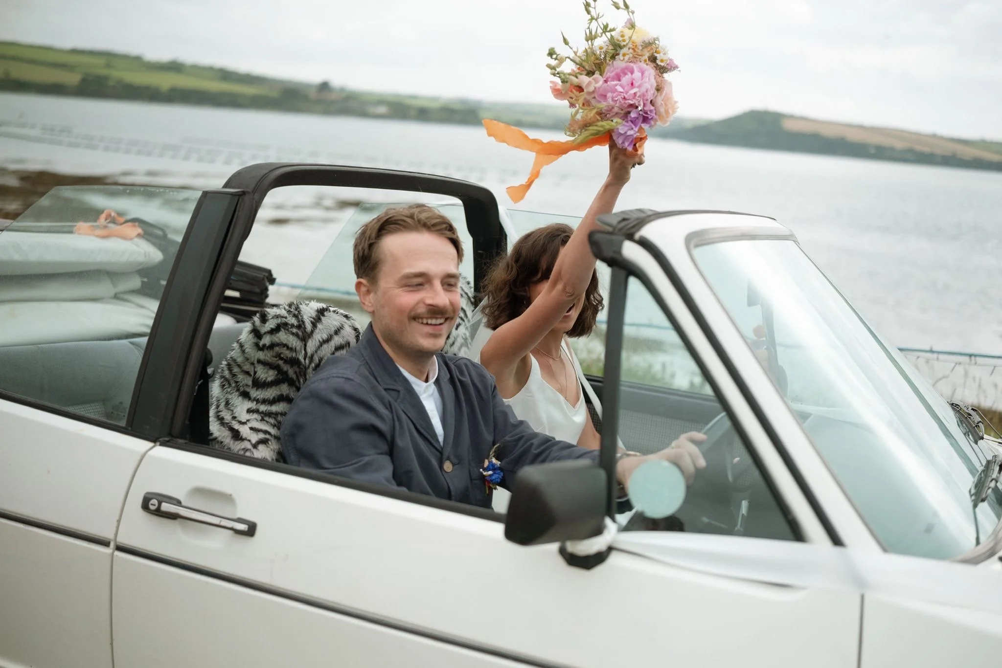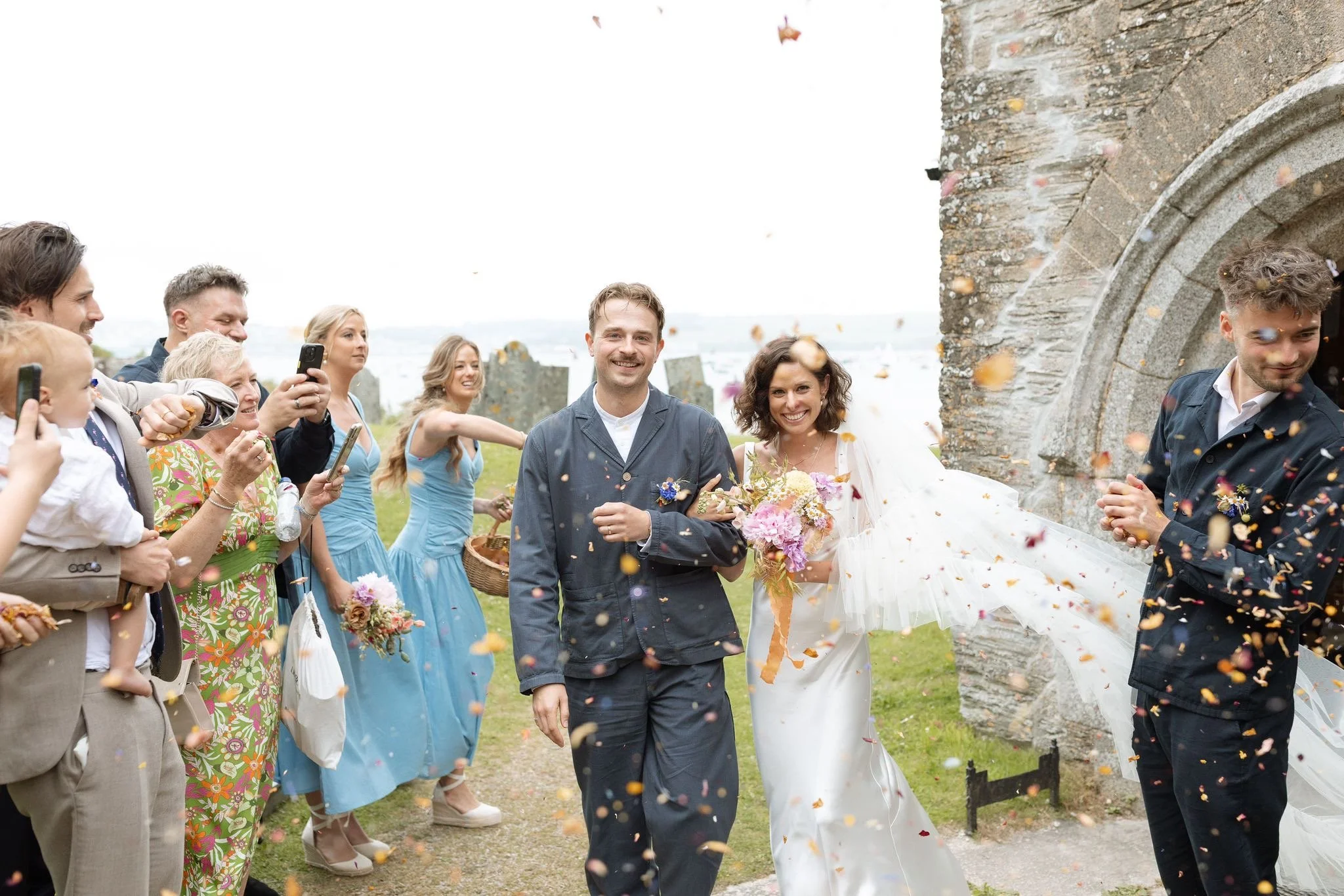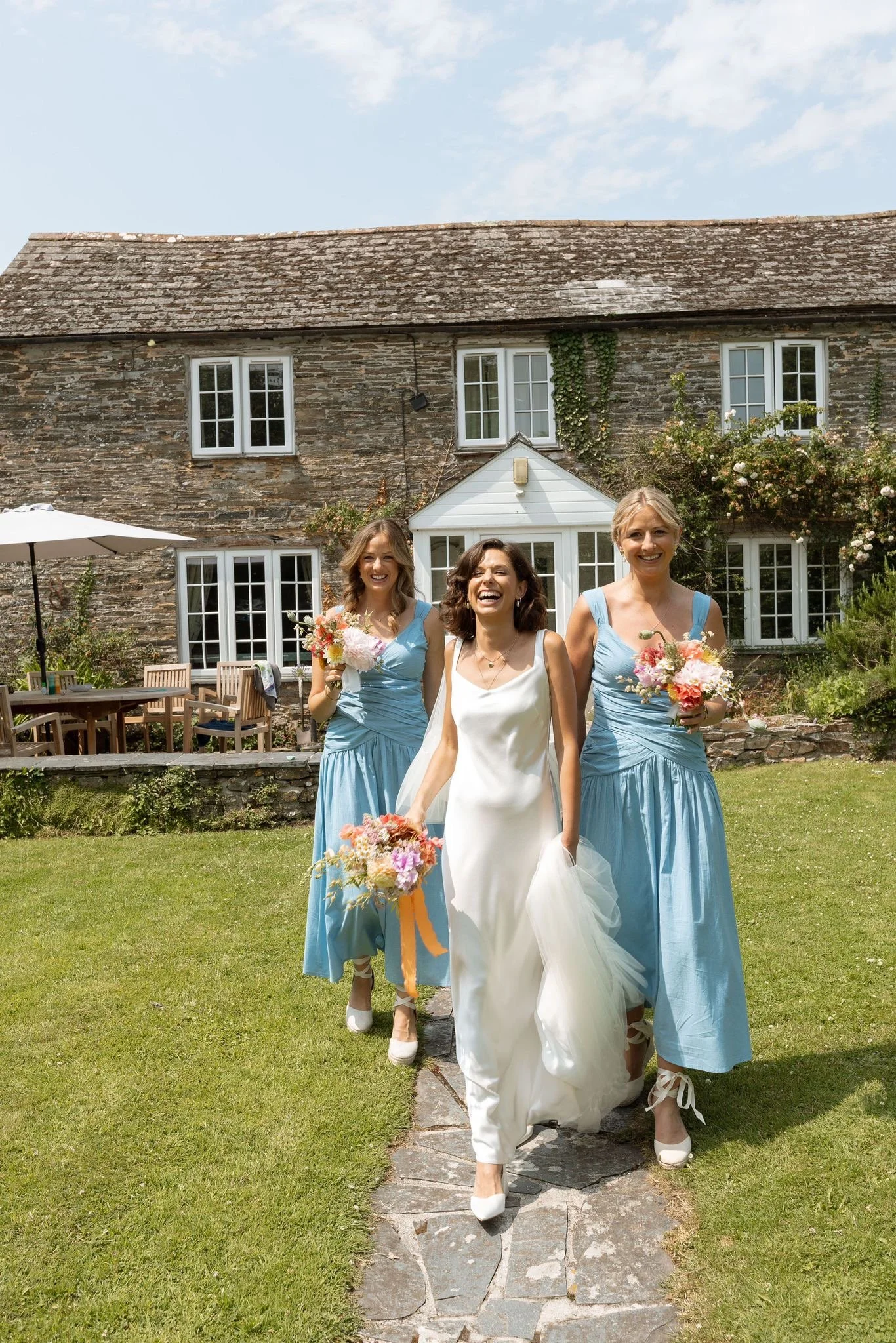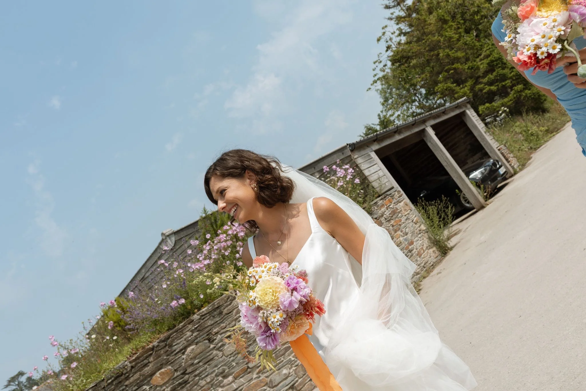 Colour was hugely important for Holly, in our initial consultation she already had a very clear vision for her colour palette - ‘bright but not garish - think Italian plaster’. I grew a collection of sweet peas and calendula just with Holly in mind - and arranged them with garden roses, dahlias and peonies blooming in sunset shades, highlighted with pops of white daisy-like feverfew.