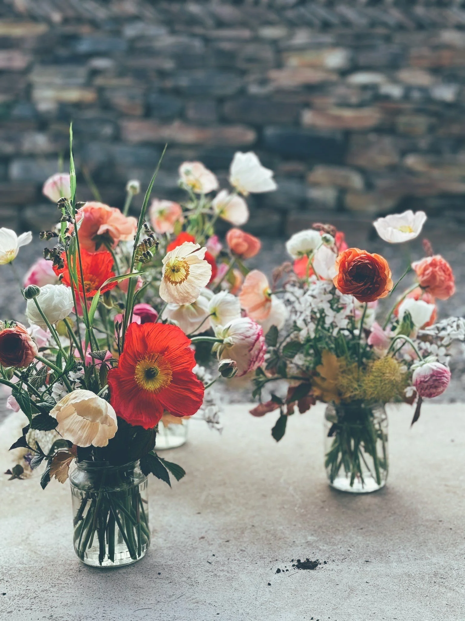 I paired ferns, forget-me-not and richly coloured fresh bramble leaves to echo the wildness of the hedgerows, with garden showstoppers frilly ranunculus and Colibri poppies.